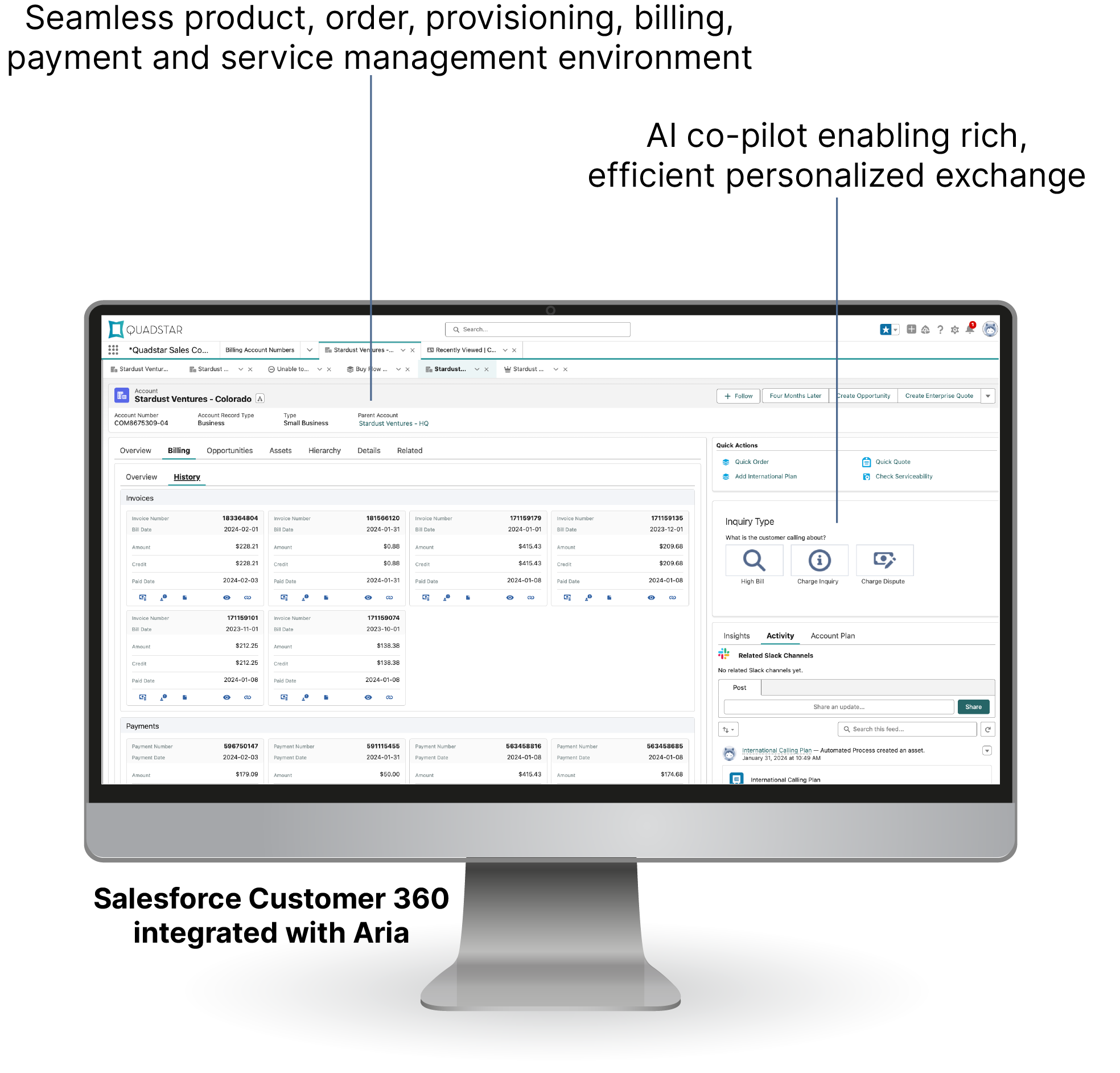 Armed with Salesforce Customer 360 and AI co-pilots, CSRs have unfettered access to billing information, payment histories and current balances, crucial for addressing the most common call center queries. AI co-pilots provide analytical support to generate, curate, and relay highly productive insight and recommendations to CSRs or customers. With direct links to Aria, CSRs can adeptly manage billing, credits, and payments, swiftly resolving customer issues and disputes, all facilitated by a single sign-on.